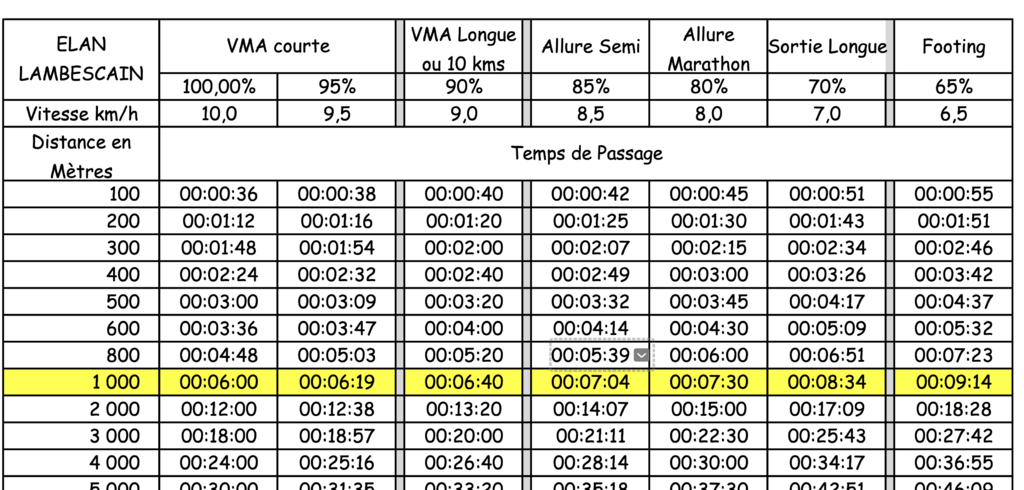 Trouvez le tableau qui vous correspond en repérant la VMA qui figure sous la mention VMA courte 100%.